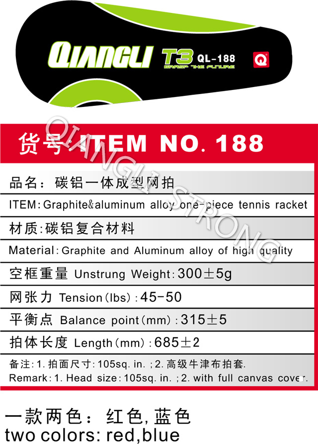 貨號:ITEM NO.188 品名:碳鋁一體成型網(wǎng)拍 Item:Graphite & Aluminum alloy one piece tennis racket 材質(zhì):碳鋁復(fù)合材料 materia:graphite and aluminum alloy of high quality 空框重量 unstrung weight:300+/-5g 網(wǎng)張力tension(lbs):45-50 平衡點(diǎn)balance point(mm):315+/-5 拍體長度length(mm):685+/-2 備注:1.拍面尺寸:105sq.in.;2.高級牛津布拍套 remark:1.head size 105sq.in.; 2.with full canvas cover |