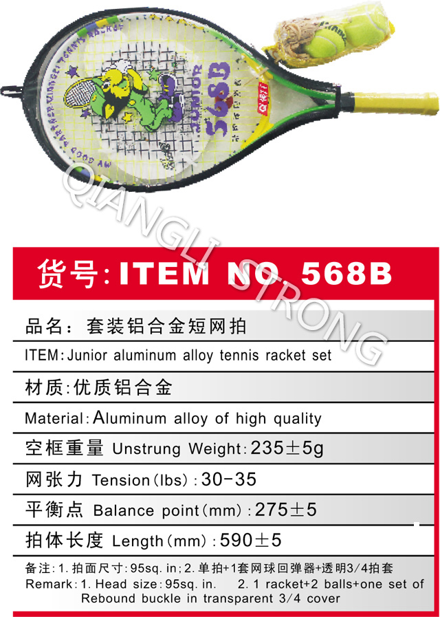 貨號:ITEM NO.568B 品名:套裝鋁合金短網(wǎng)拍 item:junior aluminum alloy tennis racket set 材質(zhì):優(yōu)質(zhì)鋁合金 materia:aluminum alloy of high quality 空框重量 unstrung weight:235+/-5g 網(wǎng)張力tension(lbs):30-35 平衡點balance point(mm):275+/-5 拍體長度length(mm):590+/-2 備注:1.拍面尺寸:95sq.in.;2.包裝:單拍+1套網(wǎng)球回彈器帶透明3/4拍套 remark:1.head size 95sq.in.;2.racket+2 balls+one set of rebound buckle in transparent 3/4 cover |