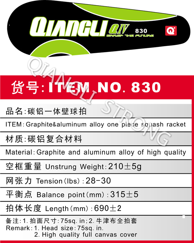 貨號:item NO.830 品名:碳鋁一體壁球拍 item:graphite&aluminum alloy one piece squash racket 材質(zhì):碳鋁復(fù)合材料 material:graphite and aluminum alloy of high quality 空框重量Unstrung weight:210+/-5g 網(wǎng)張力tension(lbs):28-30 平衡點balance point(mm):315+/-5 拍體長度length(mm):690+/-2 備注:1.拍面尺寸:75sq.in.;2.牛津布全拍套 remark:1.head size 75sq.in.; 2.high quality full canvas cover