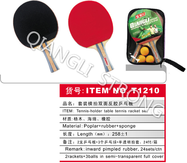 貨號:ITEM NO.T1210品名:套裝橫拍雙面反膠乒乓板ITEM:tennis-holder table tennis racket set 材質(zhì):楊木、海綿、橡膠material:poplar+rubber+sponge長度:Length(mm):258+/-1備注:2支乒乓板+3個乒乓球+半透明拍套remark:inward pimpled rubber,2rackets+3balls in semi-transparent full cover