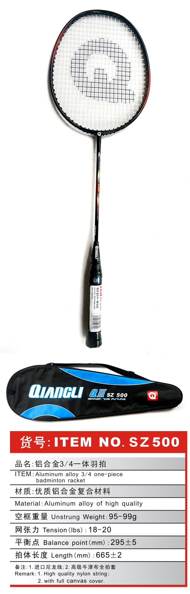 貨號(hào):ITEM NO.SZ500 品名:鋁合金3/4一體羽拍 "ITEM:Aluminum alloy 3/4 one-piece badminton racket" 材質(zhì):優(yōu)質(zhì)鋁合金復(fù)合材料 Material:Aluminum alloy of high quality 空框重量Unstrung Weight:90-94g 網(wǎng)張力Tension(lbs):18-20 平衡點(diǎn)Balance point(mm):295+/-5 拍體長(zhǎng)度Length(mm):665+/-2 "備注:1.進(jìn)口高級(jí)尼龍弦線;2.進(jìn)口高級(jí)PVC柄皮;3.高級(jí)牛津布全拍套 Remark:1.High quality nylon string;2.high quality PVC grip; 3.with full canvas cover." |