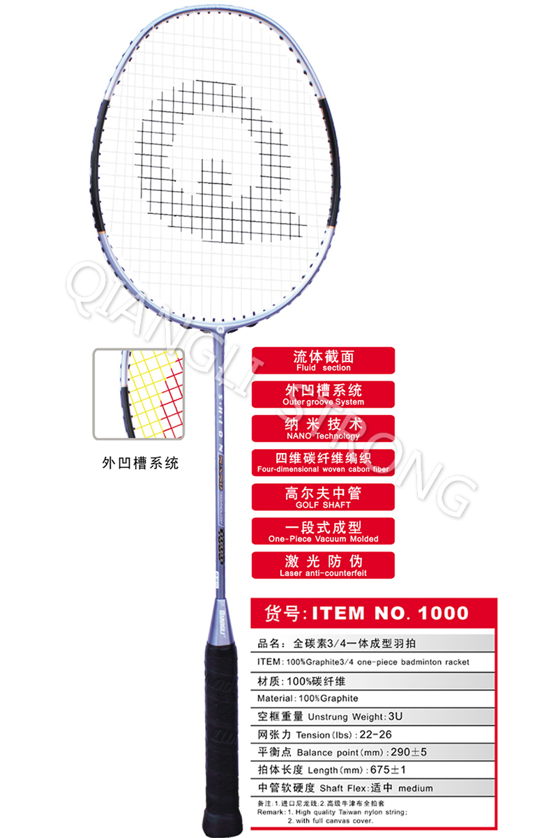 貨號(hào):ITEM NO.1000 品名:全碳素3/4一體成型羽拍 ITEM:100%Graphite3/4 one-piece badminton racket 材質(zhì):100%碳纖維 Material:100%Graphite 空框重量Unstrung Weight:3U(85-89g) 網(wǎng)張力Tension(lbs):22-26 平衡點(diǎn)Balance point(mm):290+/-5 拍體長(zhǎng)度Length(mm):675+/-1 中管軟硬度Shaft Flex:適中 medium 備注:1.進(jìn)口尼龍線;2.高級(jí)牛津布全拍套 Remark:1.High quality Taiwan nylon string; 2.with full canvas cover |
