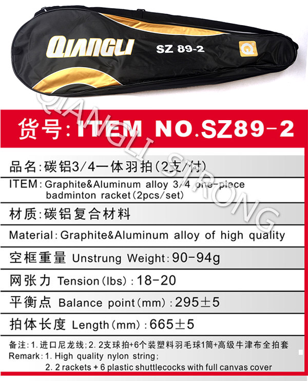 備注:1.進(jìn)口高級(jí)尼龍弦線;2.2支裝+一筒羽毛球(6個(gè))+高級(jí)牛津布全拍套